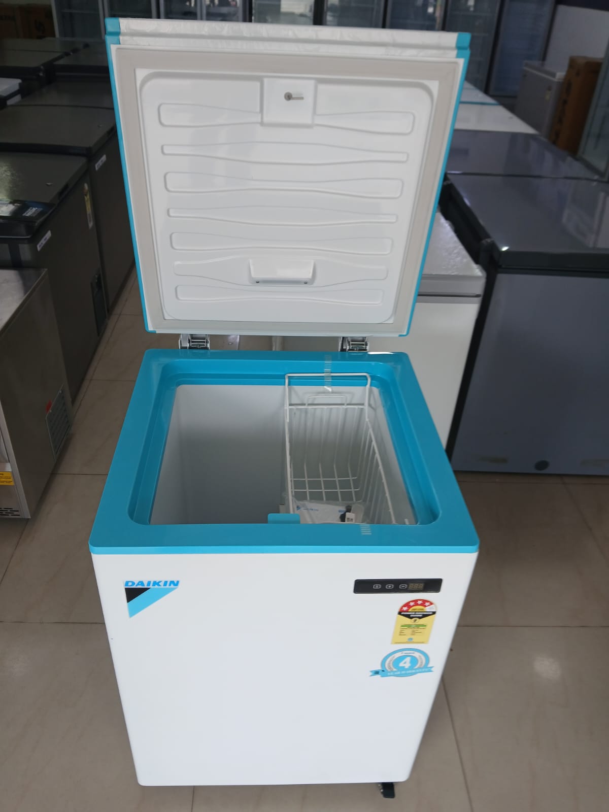 Model Overview Model: Daikin CRDF10SDBRV16 Type: Hard Top Deep Freezer Design: Single Door Color: White Suitable For: Kitchens & Restaurants 📐 Dimensions & Capacity External Dimensions: 655 (W) x 670 (D) x 880 (H) mm Storage Capacity: 99 L Gross Volume: 102 L Insulation Thickness: 70 mm ❄️ Cooling & Performance Temperature Range: -31°C to +7°C Cooling Technology: Convertible (Freezer to Cooler and Cooler to Freezer) Refrigerant Type: R-134a Star Rating: 4 Star 🧊 Storage & Shelving Number of Baskets: 1 Basket Lighting: Digital Display